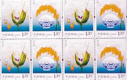 今年是杂交水稻培育成功40周年,邮政部门于10月25日首发了《杂交水稻》特种邮票1套2枚,面值2.40元,邮票票图名称分别为《制种》、《丰收》。一朵朵稻花表现的是杂交水稻的主题;一穗丰满的稻穗和一碗晶莹剔透的米饭,表现的是杂交水稻解决了中国人的吃饭问题以及对全世界的贡献。