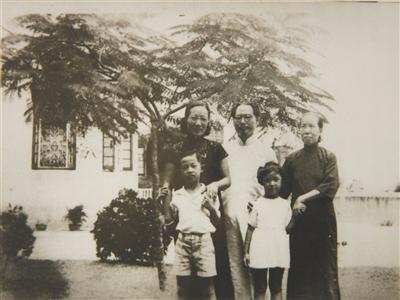 1939年,在香港住房楼下,许地山一家。许燕吉回忆说,家里是严母慈父,有一次她吃橘子,不小心咽下去两个橘核,许地山煞有介事地说:“明天你肩膀上就会长出两棵橘子树了,以后你还可以伸手就到肩膀上摘橘子吃,多好!”