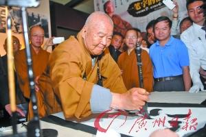 星云大师在书法展厅里现场挥毫。记者杨耀烨 摄