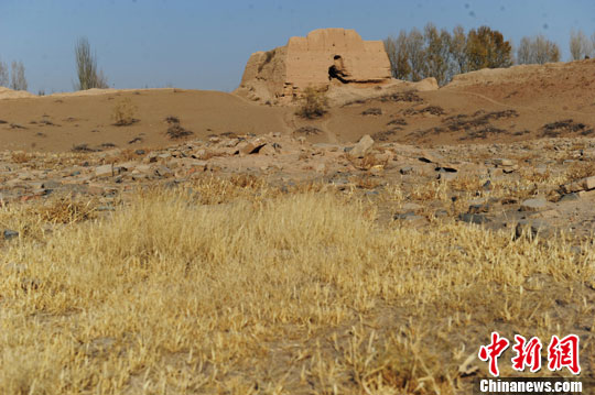 中新社记者日前探访了这座瓦砾遍地、杂草丛生的古城。距离张掖市区约17公里的黑水国遗址,除了用土坯夯筑而成的一圈布满豁口的高大城墙外,城内找不到一座建筑遗迹,满目尽是散落于荒草丛中的古砖残片和碎石土块。
