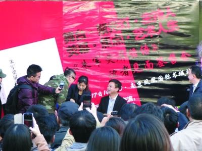 昨天下午,南京的天少有的蓝,但是初冬刮来的北风却不停的呼呼那个吹。在凤凰国际书城门前广场,著名主持人朱军“顶风”签售他的新书《朱军荧屏悟语》,现场等候的人群排得里三层外三层,朱军忙得不亦乐乎,一边签名,一边和读者合影,满足每一位读者的愿望。他说,写这本书,不仅是主持专业的回顾,更是对人生的感悟,要把每一次和读者见面,当做自己的“第一次”。在春晚舞台创造了17年传奇的他,马年是否继续,朱军表示,不到节点,心情难以表达。