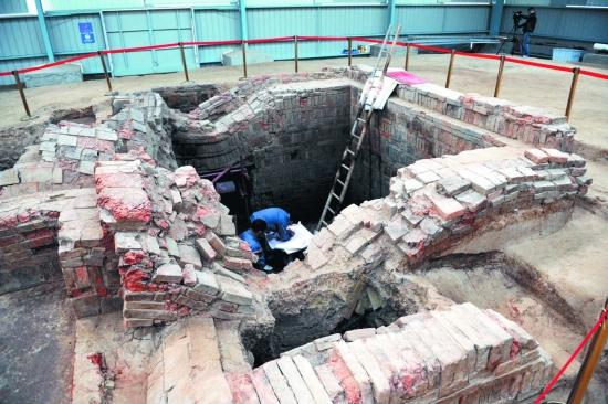 16日,工作人员在一号墓(隋炀帝杨广墓)的墓室内进行考古研究发掘。 (新华社发)