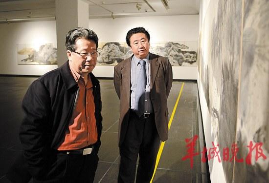 许钦松(左)在广东美术馆参观著名画家王林旭(右)的“超象”作品展