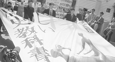 韩国民间团体在日本驻韩国大使馆外举行集会,抗议日本修改历史教科书。