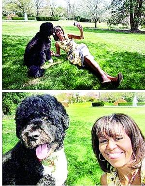 美国第一夫人米歇尔与爱犬“波”在白宫草坪上自拍。