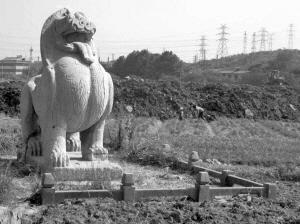 →10月下旬,栖霞大道边一处国保文物南朝辟邪险遭渣土掩埋。(资料图片)