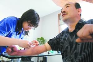 研究人员给曹姓志愿者抽血验基因