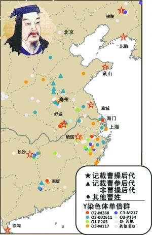 经过研究,他们推定来自辽宁铁岭、安徽舒城、安徽绩溪、江苏盐城、湖南长沙和辽宁东港的六支Y染色体单倍群为“O2-M268”的曹氏是曹操后代。