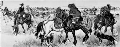 黄胄在1981年以《欢腾的草原》(上图)为题材创作了两件作品,一件现藏于北京钓鱼台国宾馆接待国宾的18号楼;另一件作为国礼由当时的国家领导人赠与美国实业家哈默博士。哈默博士除了能源巨贾的身份之外,也是著名的艺术品收藏家。(记者李健亚)