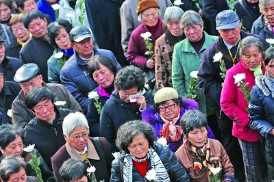 昨天一早,近300名老知青赶到雨花功德园,参加英雄知青江杭苹的骨灰落葬仪式。 宋 峤 摄