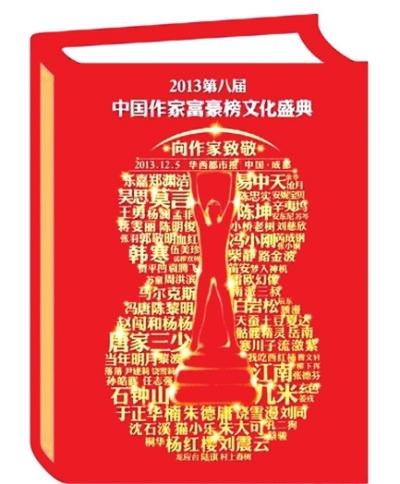 中国作家富豪榜自2006年举办以来,旨在鼓励中国原创文学,关注中国作家生存状况。每届富豪榜通过统计作家作品版税收入,从而得出作家的年度收入。在今年的作家富豪榜海报上,除了莫言、易中天、韩寒、郭敬明等榜单常客依然在列外,柴静、刘同等人也因新书畅销而获得提名。其中,同为自传形式的柴静新书《看见》,与刘同新书《谁的青春不迷茫》给读者群体带来了两股不同的反思热潮,同时也拉动了图书销量。除了刘同和柴静外,芮成钢、乐嘉、白岩松等一大批并不是专职从事写作的作者也都入围本次榜单,这在往届的作家富豪榜中较为罕见。而据记者了解,在国外的同类作家收入榜单中,榜上有名的作者也大多为不是从事专业写作的成功人士。本届作家富豪榜的入围情况,也从一个侧面反应了2013年中国图书市场的日趋完善和多元化趋势。