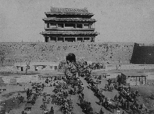 参与互动(0) 1906年,崇文门瓮城内的铁路道口。庚子事变之后,铁路线延长到前门,为此崇文门瓮城打开两个缺口,铁路就从城门前经过,这里成为交通枢纽。