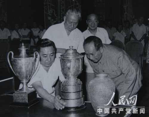 参与互动(0) 1963年,荣高棠请毛泽东、刘少奇、杨尚昆等观看中国运动员在第27届世乒赛上夺得的奖杯