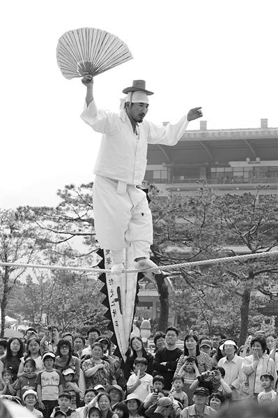 走钢丝是一项危险的表演,表演者常常需要全神贯注地挪动脚步,而在韩国,这项技艺却需要一心二用,表演者边走钢丝,还需要伴着音乐和地面上的小丑诙谐对答,伴随着音乐进行歌舞等特技表演。
