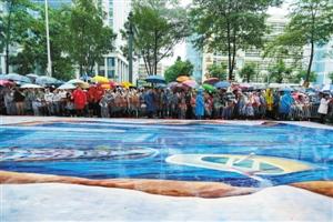 昨天,千余名观众冒雨观看一项吉尼斯世界纪录——世界上最长3D地画在盐田诞生。 深圳商报记者 贾少强 摄