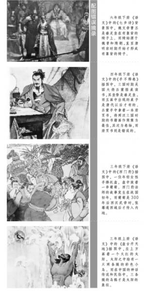 他还举了其他一些配图错误的例子。如四年级下册《语文》中的《手不释卷》插图中,三国时期吴国大将吕蒙据桌读书,其坐姿是垂足坐,画中出现的桌子是唐代以后才有的,吕蒙手中拿着的册页书那时尚未出现,应为简策或者卷轴;三年级下册《语文》中的《西门豹》插图中,一位年轻女性手捧托盘,盘中放着一串葡萄,西门豹治邺的故事发生在战国初年,而葡萄是西汉时,“张骞通西域”后才传入内地。