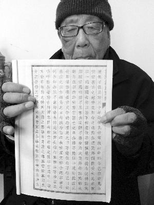 戴壁城老人向现代快报记者出示《东山公墓志铭》,其中红线部分显示戴瑞珊曾找到了建文帝现代快报记者 施向辉 摄
