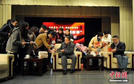 12月26日,中国首位诺贝尔文学奖获得者、中国作协副主席、北京师范大学国际写作中心主席莫言,江苏省作协副主席、著名作家苏童,清华大学教授、著名作家格非一行走进著名侨乡福建省福清市,出席由北京师范大学国际写作中心、福建省作家协会主办的以“如何讲述中国故事”为主题的作家讲座。当日,著名作家们的精彩讲座,博得现场观众如潮般的掌声。图为著名作家莫言、苏童等为众多读者签名。刘可耕 摄