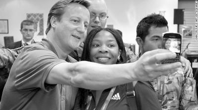 英国首相卡梅伦与伦敦奥运会志愿者一起玩儿自拍