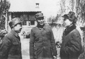 人民解放军长春前线司令员肖劲光(中)、政治委员肖华(左)接见曾泽生(右)
