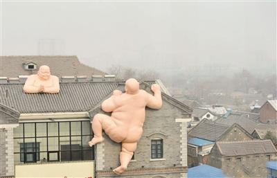 1月19日,两尊“裸佛攀房”艺术雕塑亮相济南,“小沙弥”憨态可掬的攀房造型吸引不少路人观看。图为双手合十“裸佛”召唤“小沙弥”攀房。 张勇 摄