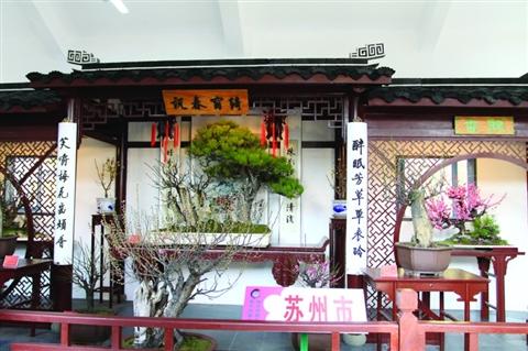 苏州园林部门从各个园林精选了18盆特色梅桩,并制作了3盆写意盆景参展,独具特色的苏州劈梅以其独特的意蕴、文化内涵和精湛的栽培技艺水平获得了好评。现场搭建的苏州展馆“绮窗春讯”古色古香,展现了古典园林厅堂的典雅精致,与梅花相得益彰。