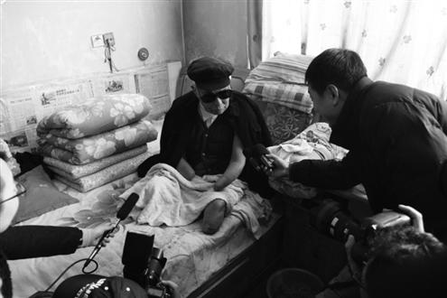 在朱彦夫的家中,一切都是整洁的,他坐在床上,身体虽已经偏瘫,但依然会直直的坐着。一双假肢,还套着军鞋,他时刻都提醒自己,要以一名军人的志气活着。