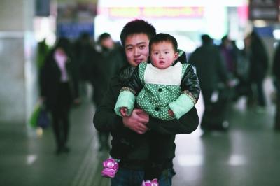 这次去拍摄春运版爸爸去哪儿,张力提前做了点策划:“什么年龄段的拍几张,大概要采访他们什么信息,但是主要还是碰运气。”上午11点钟,张力和女朋友到了火车站,“我第一眼就看到了江西的廖先生,他怀里抱着一个孩子,孩子好像有点闹脾气,正在温柔地安慰孩子。”“我已经在杭州工作好多年了,每年都是这样回家,孩子跟着我们一起坐火车也很辛苦,但是没办法,得回家过年啊!”廖先生爱怜地看了一眼怀里的儿子,“本来也想放在家里让爷爷奶奶带的,但是她妈妈舍不得,我们就大人小孩都辛苦点,带在身边了!”