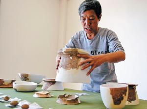 桥山遗址出土的陶片拼接修复的陶器。 本报记者 武威 摄