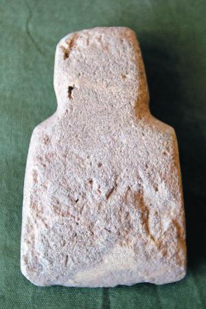 桥山遗址发掘出土的双肩石斧。 本报记者 武威 摄