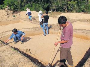 1月16日,记者赶往陵水桥山遗址处,在新一轮发掘现场,中国社科院考古研究所研究员傅宪国,带着考古队员张小波、郑云峰、徐浩宁等人正在进行土层切片。而周围仍是大片大片的芒果、西瓜地。