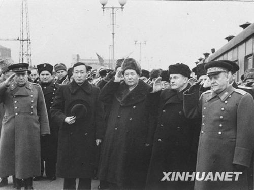 参与互动(0) 1949年12月至1950年2月,毛泽东首次访问苏联。在抵达莫斯科车站时,受到苏联党政领导人布尔加宁(右一)、莫洛托夫(右二)等的热烈欢迎。右四为王稼祥(资料照片)。