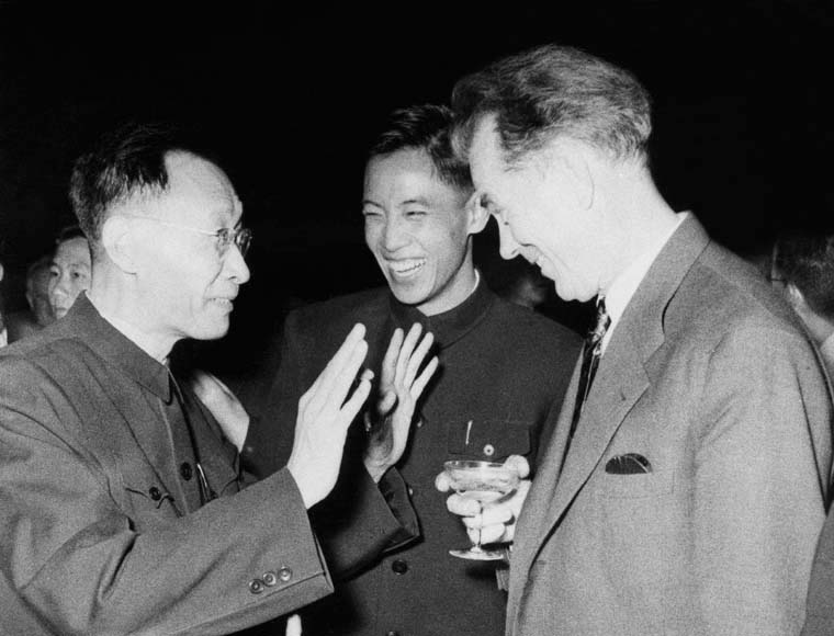 参与互动(0) 中共中央书记处书记、中联部部长王稼祥(左一)与丹麦共产党主席阿克赛·拉森(右一)交谈。
