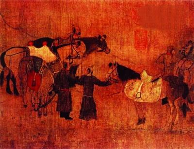 五代:胡坏《卓歇图》局部。五代时期出现了赵嵓、胡坏、李赞华、王汉等画马高手。他们久居大漠荒原,熟悉那里的一切,以写生的方法创作出了一幅幅精美之作。《卓歇图》是胡坏的力作,“卓”是立的意思,“卓歇”就是支起帐篷休息之意。