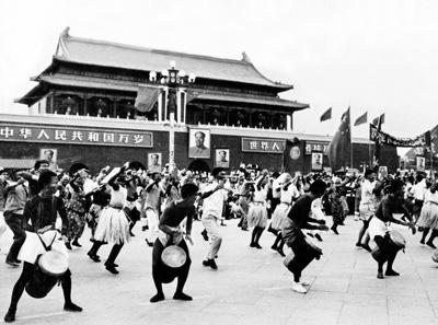 一九六七年,首都青年在天安门前表演非洲舞蹈,欢迎卡翁达总统。