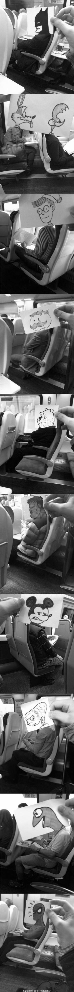 今年春节坐火车时你还在打牌、发呆、玩手机刷微博吗?太没创意啦!微博上一名叫October Jones的网友,身为插画师的他,喜欢在火车上给同车厢周围乘客换上自己绘制的卡通人物头像,来打发旅途时间,并将手绘作品上传社交网络。很有审美品位的他,可以根据不同乘客的外貌和服装造型,给他们配上蝙蝠侠、维尼熊、绿巨人、米老鼠的头,因此被“换头”后的乘客看起来毫无违和感。许多人发现被画的竟是自己后,表示颜色搭配得这么好,很想把这位“神笔马良”约出来见一面,并承诺保证决不会打他。“匹配度堪称百分百!”围观的小伙伴们纷纷膜拜,火热转发图集后,几个花痴还问:“楼主,能给我画张李敏镐欧巴的吗?”