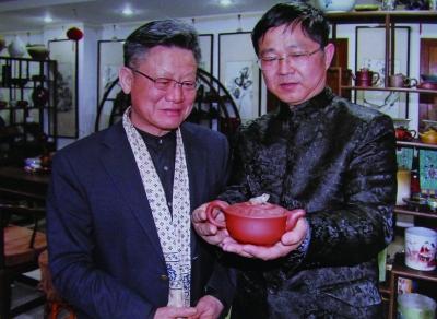 江苏省工艺美术名人陈富强向联合国副秘书长沙祖康(左)介绍其紫砂作品。