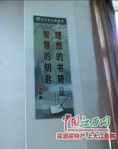 2月25日16时,网友“鄱湖唱晚”在江西微博上称,九江学院主校区图书馆五楼图书馆惊现署名为托“耳”斯泰的标语,该网友随即还吐槽称:“你们这样乱改人家名字,你们家人知道嘛!”对此,九江学院图书馆一名负责人称,网友反映的情况属实,将立即更换。