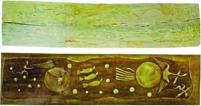 那些棺木中有一组木刻画,画面包括星象图、泗水捞鼎图、舞乐杂技图等内容。两块星象图是纵向放置在棺盖上的。一块长188厘米、宽45.3厘米、厚3.5厘米,左方刻有圆日与金乌,金乌的头尾在圆日的两边,上首和右首分布9个小日,左上一人奔跑,推测应为古代传说中的“后羿射九日”。右方刻有圆月,月中有蟾蜍、白兔和半弧形线条,下有一人,将画面连贯起来赏析,大约就是传说中的“嫦娥奔月”。圆月后面分布七颗星辰,其中三颗连成直线,另四颗斜角排列。日月之间有三条鱼形图案。