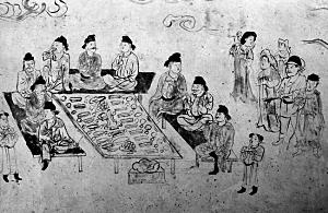 2.唐代壁画上的场景已变成了众人围坐在一