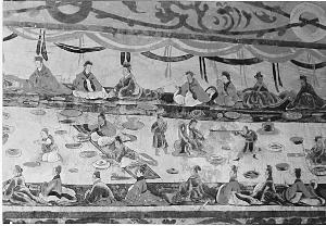 1.汉墓壁画上可以见到席地而坐、一人一案的宴饮场面。