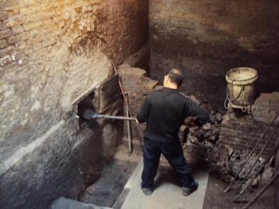 崇师傅说,当年教他烧“地龙”的师父早已经不在了,当时师父教了他烧“地龙”的技巧。烧“地龙”,一年四季烧炭火的方式也会时常变化。比如“箩炕火”,这样的火烧出来就能将灶膛上方的水均匀加热;“花锹火”,即是用铁锹一锹锹少少地往灶膛内加煤;“宝塔火”就是将煤炭堆起来像个塔一样燃烧。夏天因为温度高,所以只要烧“宝塔火”就行了。冬天天气冷,温度低,难受热,就要烧“箩炕火”,受热会均匀也快一些。