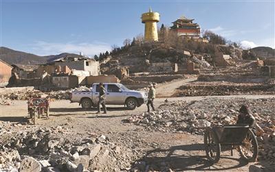 图为3月10日,几名建筑工人在遭受火灾侵袭的独克宗古城收集可用的建筑材料。 新华社发