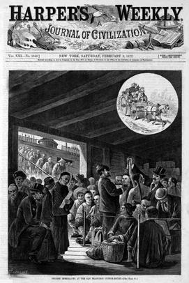 当年华人劳工到达旧金山被严格检查的绘画