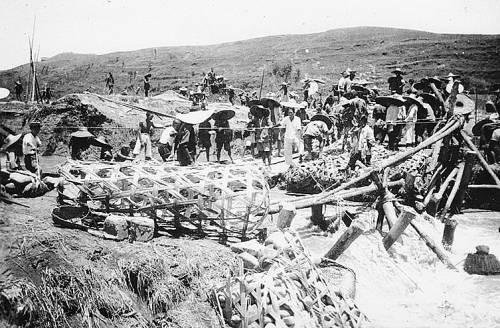 1938年的第一天,郑泽堰正式开工,近两万民工参与施工。没有洋铲,工人用竹篾编成簸箕,铲起土就跑;没有吊车,工人把一米多长的石条绑在竹竿上,在地上洒水减少摩擦力,拖着石条走。