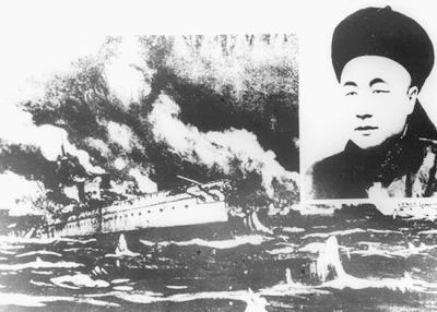 上图为甲午战争中的黄海大战。 图右上为北洋舰队将领邓世昌像。 资料图片