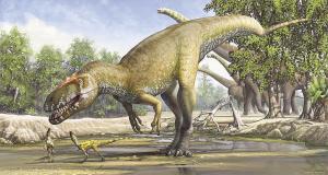 两名葡萄牙研究人员称,他们在葡萄牙发现一种距今1.5亿年的新型恐龙化石。这种名为“格氏蛮龙”的恐龙体长可达10米,体重4至5吨,长度超过10厘米的牙齿如刀锋一般锐利。两名研究人员说,这一新发现的恐龙是欧洲大陆迄今发现的最大型陆地食肉动物,可能位于食物链顶端,也是侏罗纪时期体型最大的生物之一。这是“格氏蛮龙”(中)复原图。