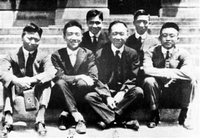 在哥伦比亚大学,陶行知(右一)与胡适(左二)等师生合影。