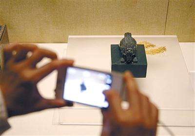 此次展览中,乾隆玉玺“万世法戒之宝”无疑是一大亮点。乾隆皇帝一生刻印很多,这一方印是专门用于祭祀使用的。“印上刻着‘万世法戒之宝’,表达对祖先的恭敬,对自我欲望的克制。”天坛公园文物科马科长说。