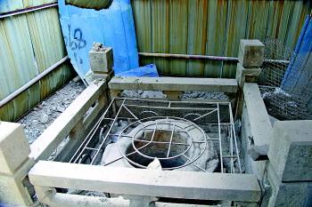 ▲被蓝色铁皮包裹的舜井,落满渣石。
